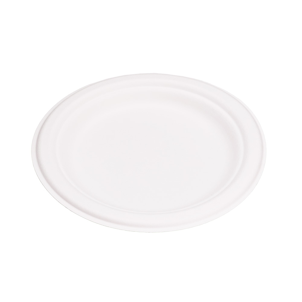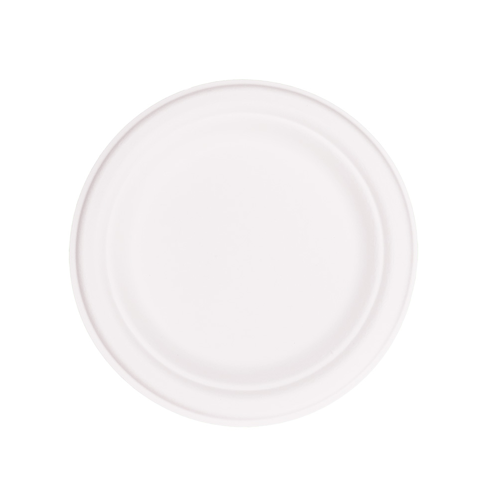 Round Compostable White Bagasse Plates made from Sugarcane fiber. Ideal biodegradable tray for catering and event supplies.